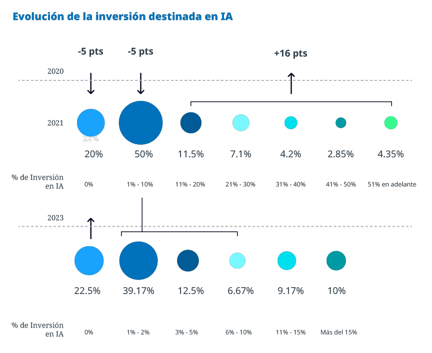 La implementación e inversión son dos elementos que han evolucionado. Así, incluso empresas más tradicionales están subiéndose a la tendencia y utilizando IA para mejorar la experiencia del cliente. En cuanto a empresas líderes en tecnología, el 15% planea destinar más del 15% de sus ingresos anuales en proyectos de IA.